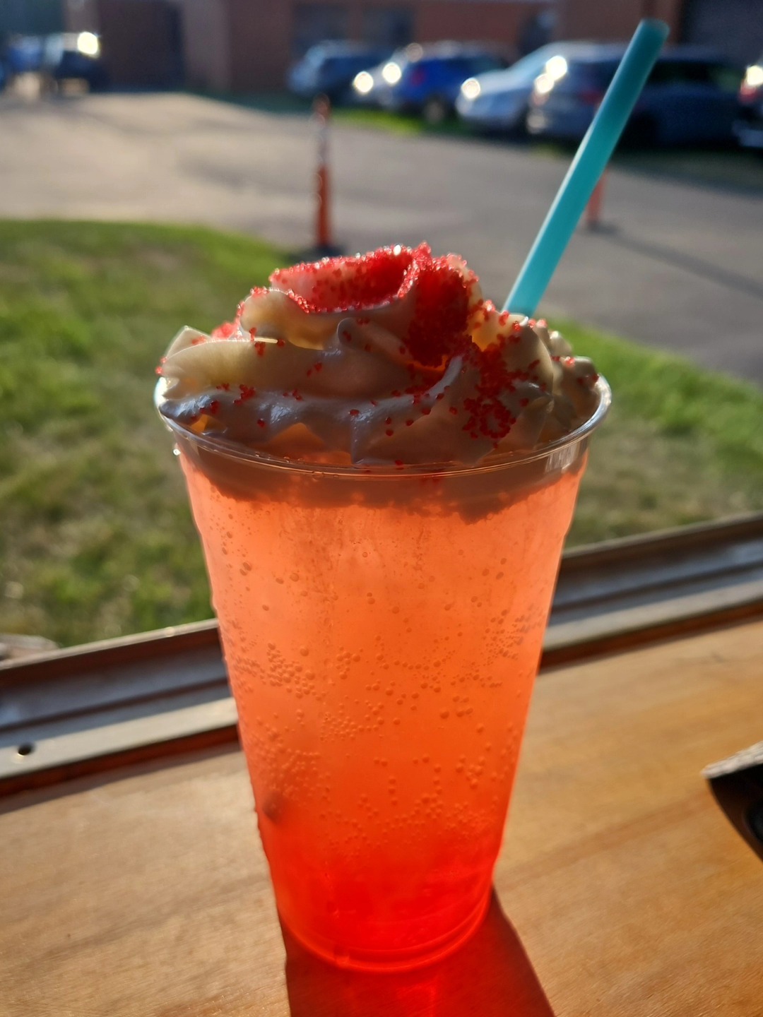 Sprite or Sprite Zero, Strawberry Syrup, Raspberry Syrup, Topped with Whip Cream and Red Sprinkles.